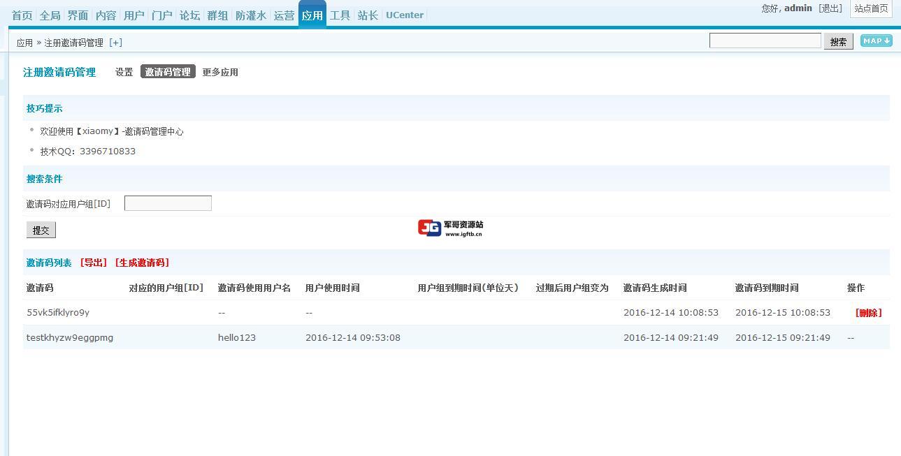 3.插件后台生成邀请码可设置邀请码前缀字符、注册后默认用户组、注册后用户组有效期、用户组过期后的用户组