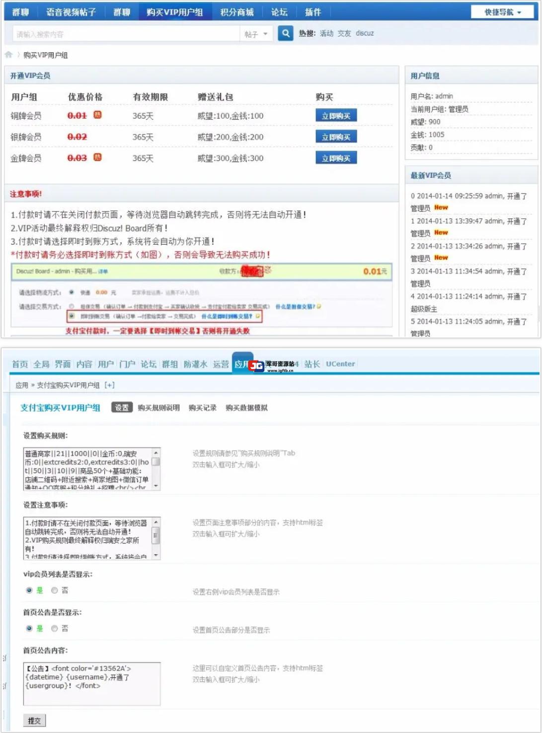 2,以论坛公告的形式,显示购买信息。可在后台控制开启或关闭。