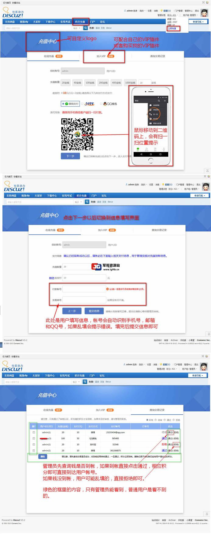 3、管理员收到支付消息(一般手机支付宝、微信、还有QQ收到钱之后会即时提醒)以后,进入网站,点击网站上的审核通过按钮,则积分充值成功,用户帐号的相应积分额度会即时到帐。