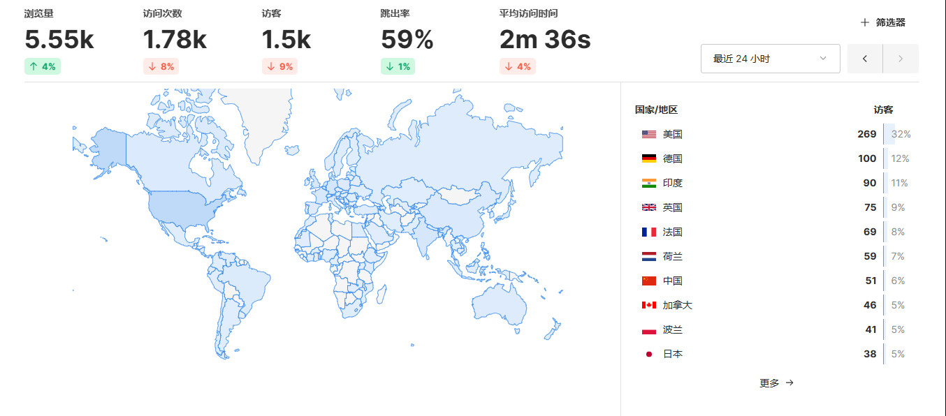 统计功能基本的都有,和国内的百度统计相比少了搜索关键词的展示。作为一款轻量使用的统计来说足够了。