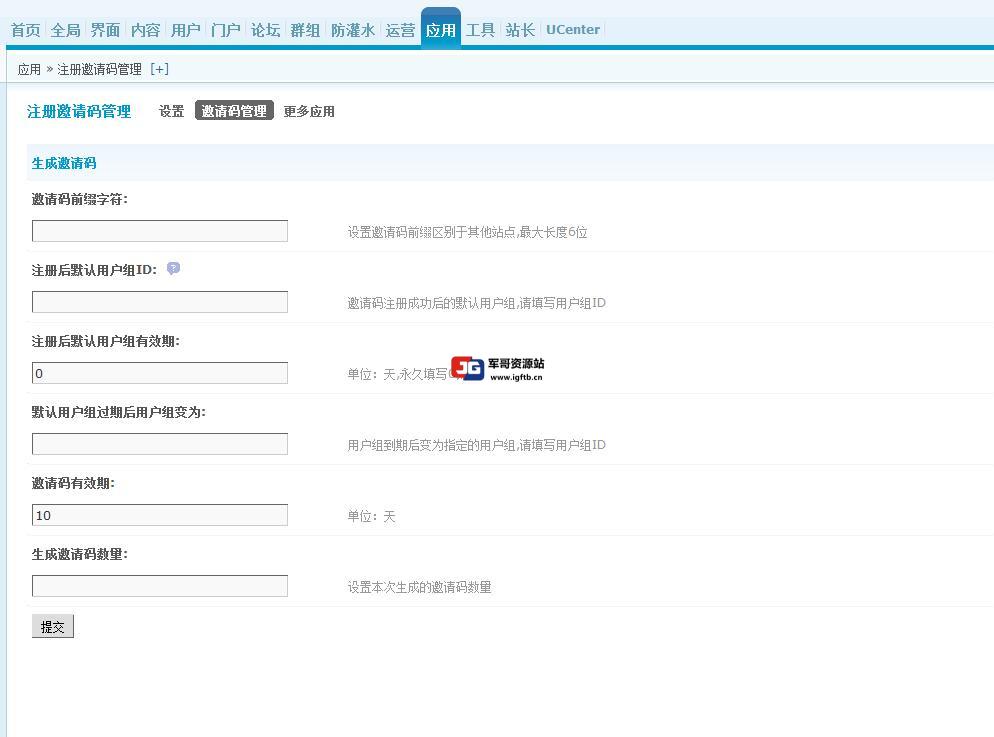 3.插件后台生成邀请码可设置邀请码前缀字符、注册后默认用户组、注册后用户组有效期、用户组过期后的用户组