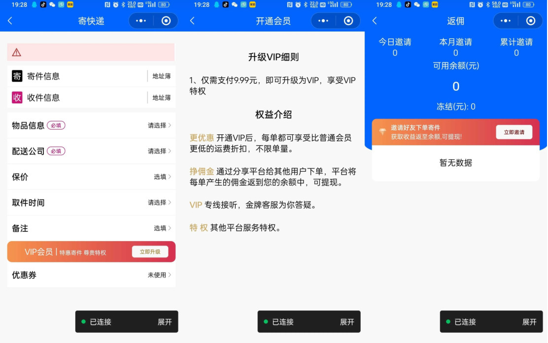 快递小程序,主要就是帮别人发快递,在原本的用户与快递之间,增加中间代理,用户在小程序下单,我们把用户需要发的快递聚集到一起,团购更优惠的价格,赚取其中一个差价!当订单量较大的时候,就有与各快递平台合作的价值,能拿到更优惠的价格!小程序还包含了完善的广告管理、会员和分销功能!支持官易达/云洋第三方平台接口接口!